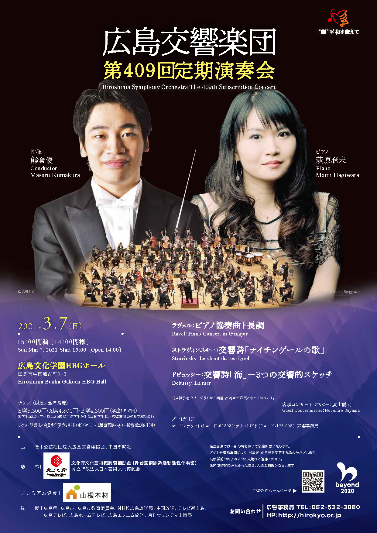 2021年3月7日(日)広島文化学園HBGホールにて開催、広島交響楽団 第409回定期演奏会の公演記録とレビュー/コメントのアーカイブページです。